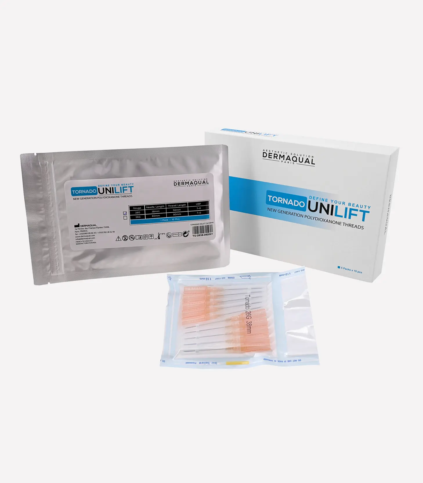 The TORNADO UNILIFT is a twisted pair of two mono-PDO threads combined into a single thread. Because it is a double thread and creates a large fibrotic channel, this new generation polydioxanone thread helps produce a better regenerative effect on the skin tissue. Intertwined double PDO thread is thicker and stronger than mono-PDO thread because the threads are braided, so they are more flexible and elastic than mono-PDO thread. The effect for lifting skin is more powerful. Presentation Sterile, reabsorbable, tornado polydioxanone medical suture with sterile hypodermic cannula intended for single use.